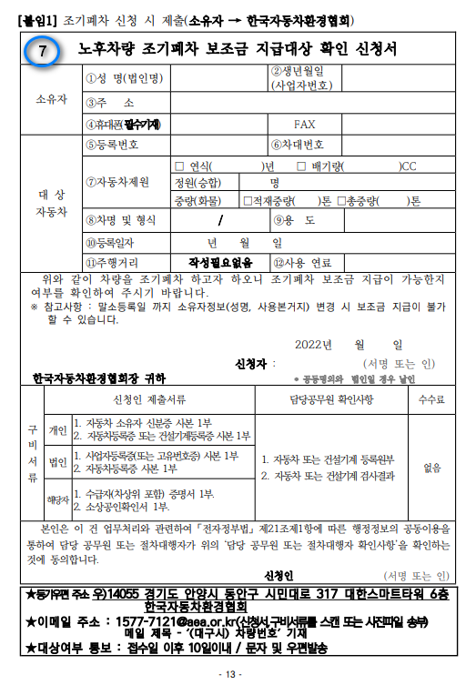 ⑦ 노후차량 조기폐차 보조금 지급대상 확인 신청서를 기재하고 신분증. 사업자등록증, 자동차등록증을 첨부합니다.
