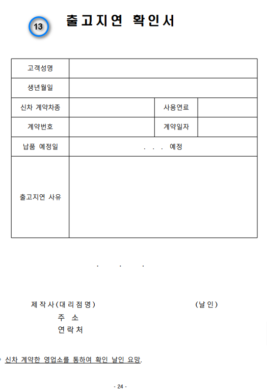(12) 자동차 제작사 사정상 신차 출고가 지연되어 청구 불가시 청구기간 10일 이내 연장신청서, 출고지연 확인서를 제출해 미리 연장합니다.